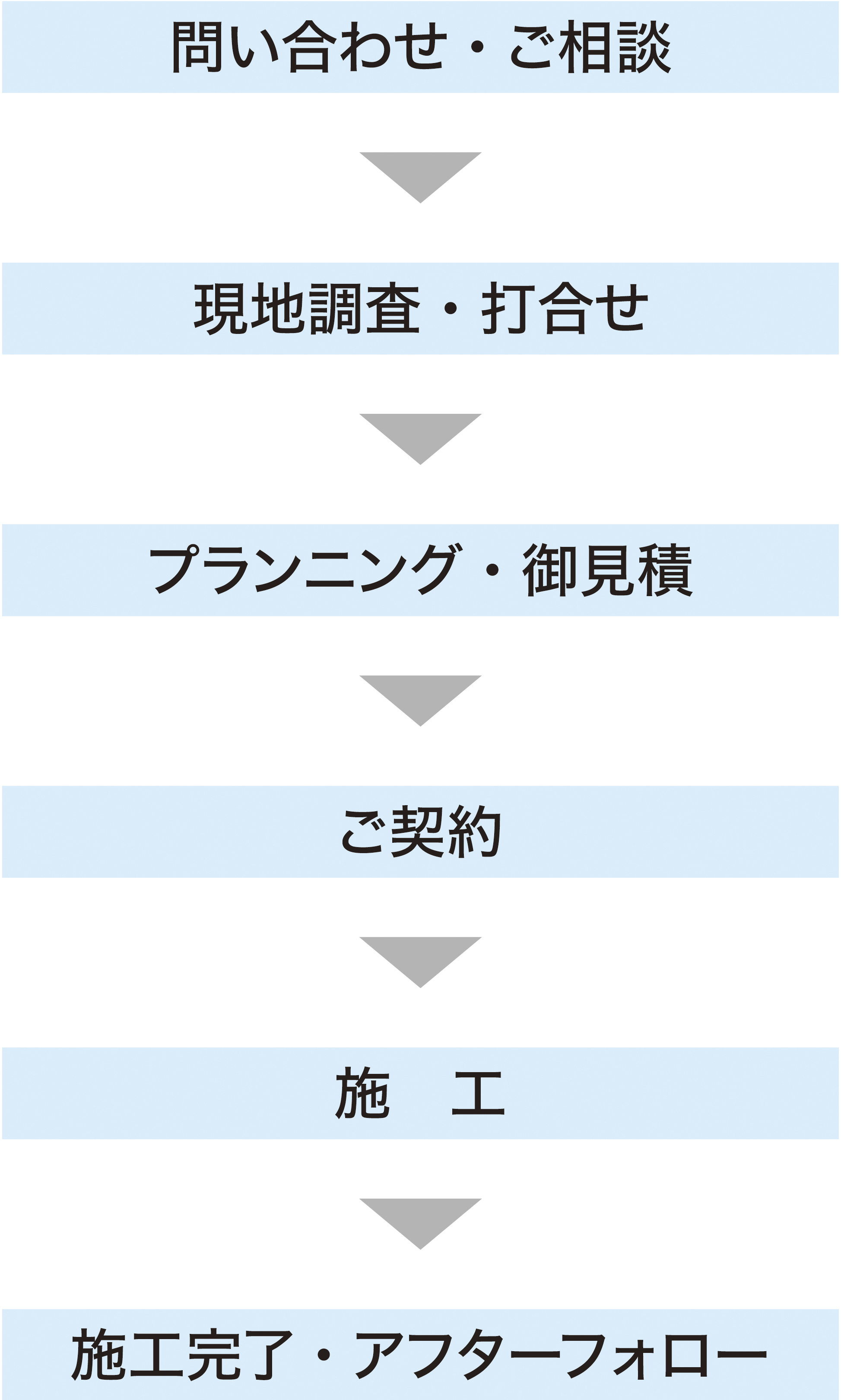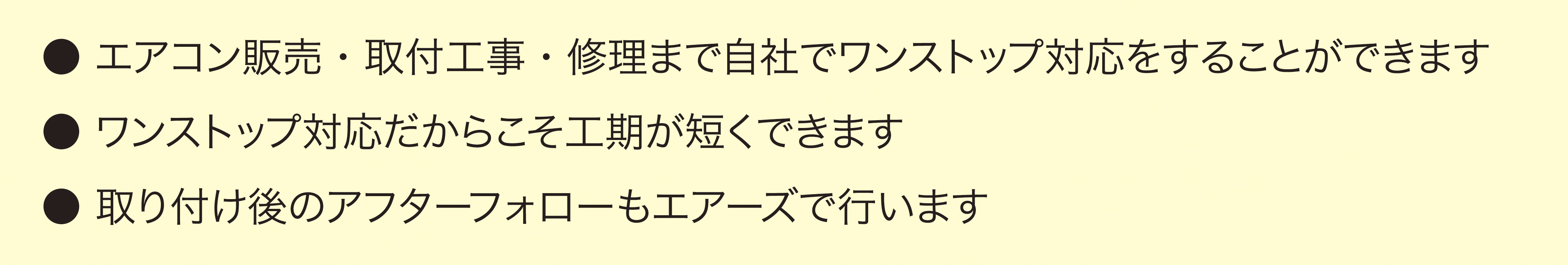 主とする空調工事では、業務用エアコンの取り付けや増設・メンテナンス・入れ替え・撤去などの工事を行っています。工業施設・ショッピングモールなどでは大きな空調機器を1か所に取りつけ、ダクトやファンを使って空気を循環させることで建物全体の温度・湿度を管理するところもあり、大規模な工事になることもあります。 業務用空調から家庭用のエアコンの取りつけまで手広く行っており、工事だけでなくメンテナンス業務も行っております。さらにアフターケアの充実など「お客様の声を大切に」専門分野に特化したスタッフの知識と経験を終結し、完成まで安全に導きます。
