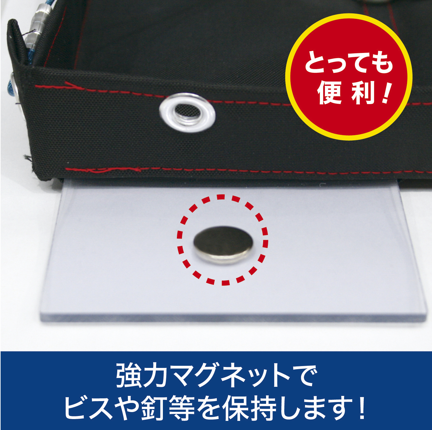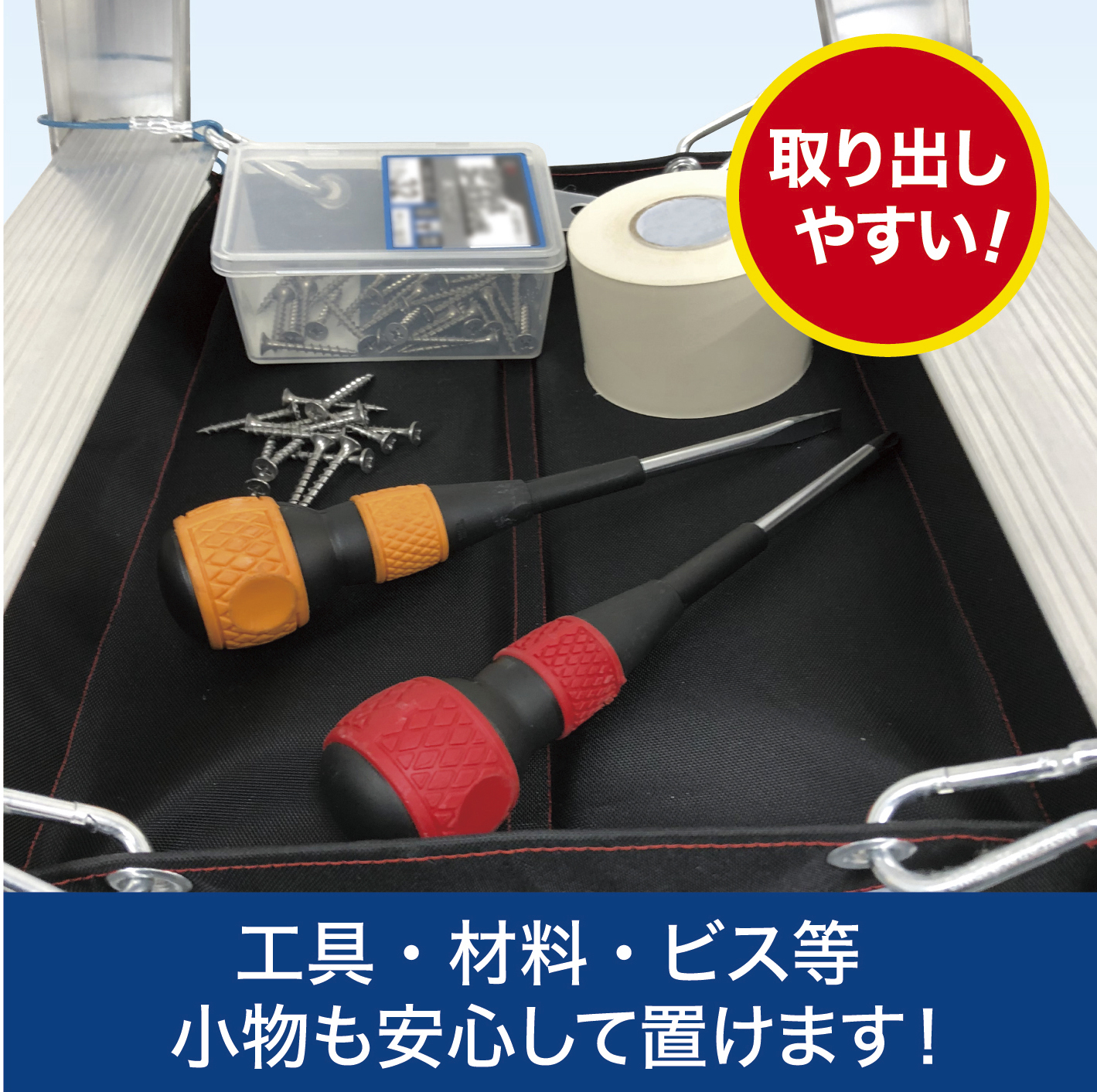 □ 高所作業時の上り下りの回数が減りました。工具や部品を落とさなくなりました。 □ 従来は道具を置く場所が無かったのでとても重宝しています。 □ 作業時間が短縮されたような気がします。とても便利です。 □ 部品交換時のネジ(ビス)をポケットに入れていましたが、取り付け忘れがなくなりました。 □ 他メーカーの物よりも丈夫で満足しています。